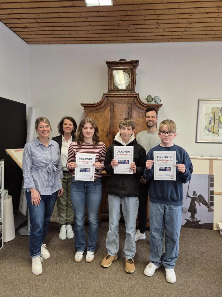 Nach der Auswertung der ersten Runde wurden die jeweiligen Klassensieger zu einer zweiten Wettbewerbsrunde eingeladen, um auf Schulebene die Schulsieger zu ermitteln. Hierbei mussten noch komplexere Fragenstellungen aus verschiedenen Themengebieten beantwortet werden, was insgesamt Emile Olschewski (10a), Ida Müller (10c) und Tristan Lehmann (8b) am besten gelang. Der Schulsieger Emile Olschewski hat somit noch die Chance, sich in einer weiteren Runde auf Landesebene mit anderen Schulsiegern zu messen.